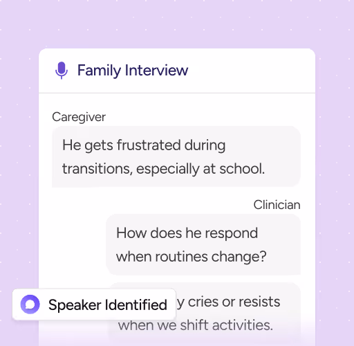 Upload messy intake packets, and Intraverbal will organize key data background info, presenting concerns, family notes — into clean summaries for your review.